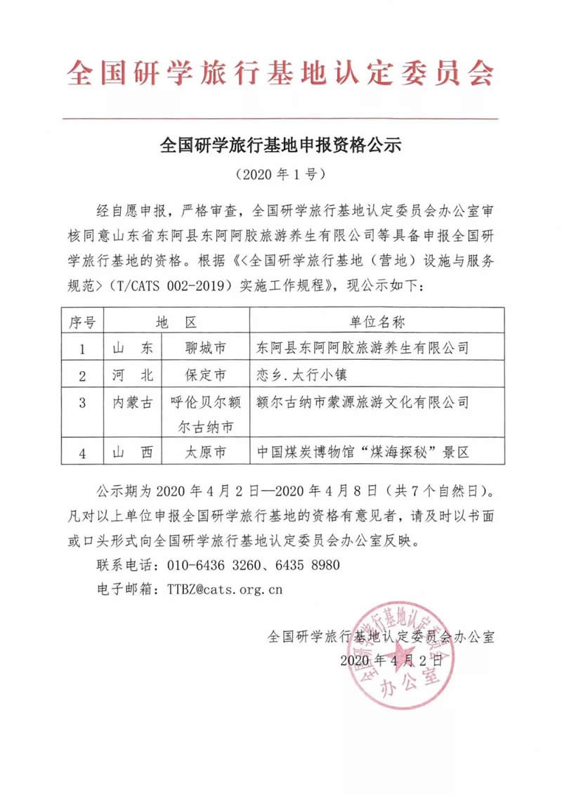 通知公告 | 全国研学旅行基地申报资格公示 —— 2020年第1号