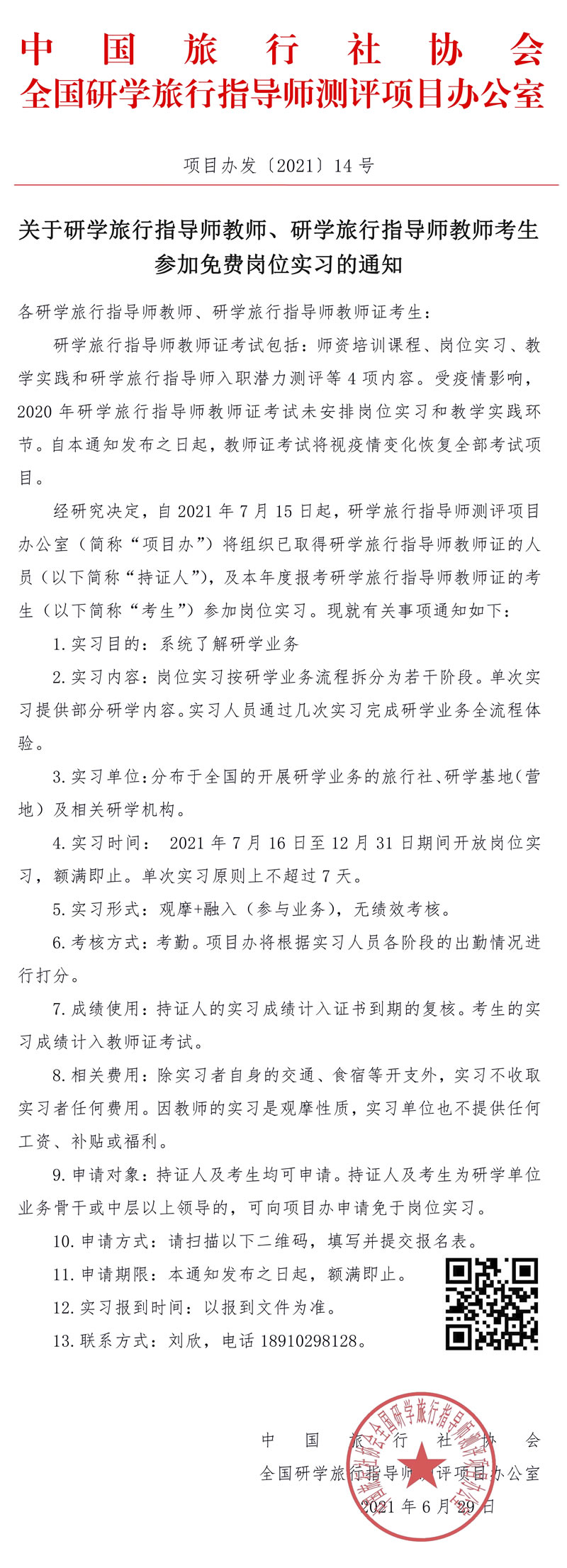 关于研学旅行指导师教师、研学旅行指导师教师考生参加免费岗位实习的通知